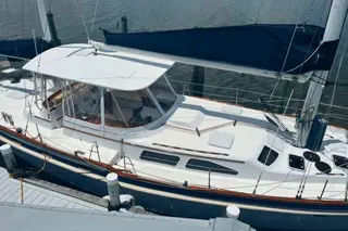 Pas clair sur la photo, mais je suppose que l'écoute qui est dans la poulie à l'arrière de la bôme doit longer la bôme jusqu'au mât, descendre le long du mât et revenir au cockpit pour réglage.