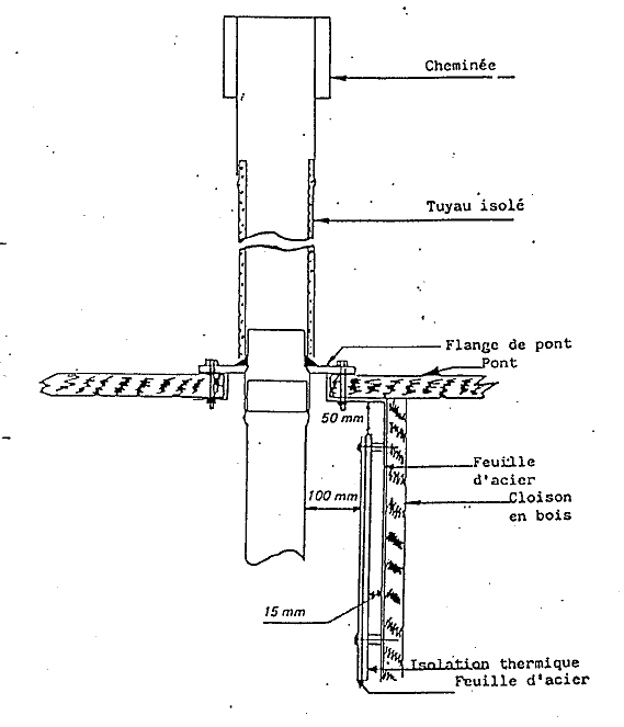 Sur mon deuxième bateau (un mélody), le chauffage était un réfleks grand modèle que j'avais installé à l'avant tribord du carré (j'avais démonté le retour du L du carré pour laisser une place "de choix" à cet appareil tout de même un peu imposant...). Le conduit de cheminée (toujours récupéré chez le ferraillou du coin...) était (est toujours, d'ailleurs, l'installation est toujours en place et fonctionne trés bien depuis 7 ans) un tube de 2,5 mm d'épais sur le quel j'avais soudé des pattes fabriquées maison qui permettait de le fixer à la cloison à l'aide de boulons. le passe pont était celui d'origine (ainsi que le champignon).