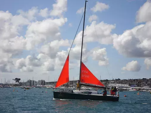 On a fait du près pendant des heures, pointe de vent 48 noeuds, on avait le numéro de fédération sur un panneau en tissus entre les deux chandeliers centraux, il était souvent totalement sous l'eau. Deux écoutes de 24mm cassées (ok, matériaux de l'époque) avec un génois 4, j'en garde encore un morceau, pammm ça explosait, viiiiire et on refaisait le noeud sous le vent.