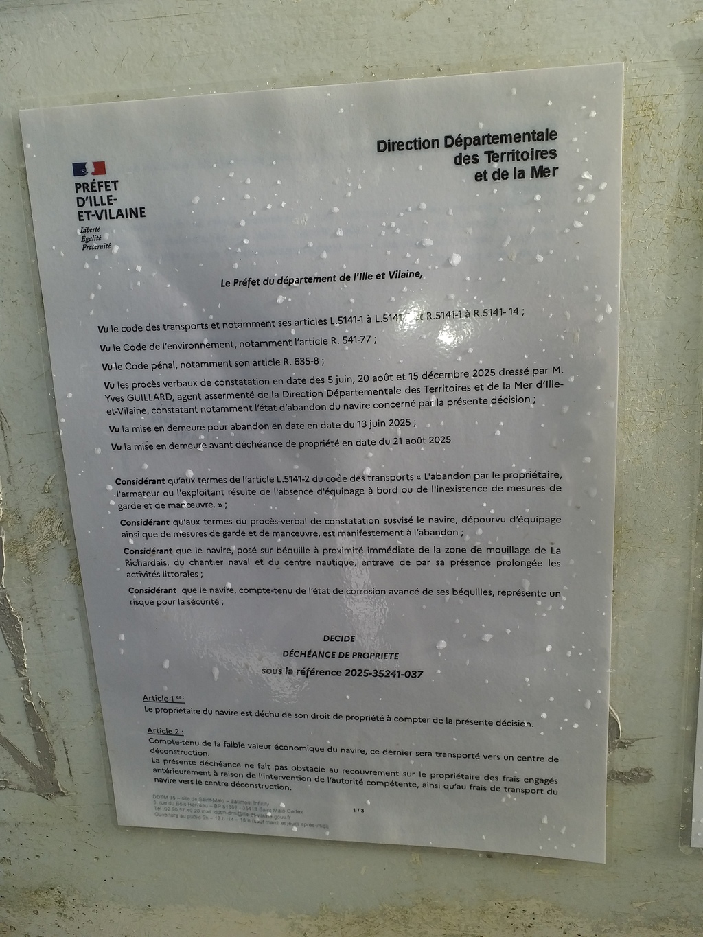 j'ai posté cela dans le but d'éventuellement toucher une personne qui serait intéressée pour retaper ce pauvre rafiot . La déchéance étant prononcée, j'imagine qu'une personne disant retirer cette épave gratos sera la bien venue à la mairie de la Richardais.